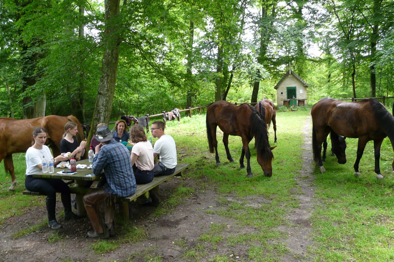 Il faudra attendre encore un peu avant de manger, le temps de s’occuper des montures. On ferme le périmètre pour qu’ils ne s’échappent pas, on desselle les chevaux, on les laisse brouter l’herbe. "Attachez-les, pas trop près, pas trop loin non plus". Directif mais pédagogue sous son chapeau en cuir, Rémi Fontaine distribue à ses compagnons du jour conseils et anecdotes. "Vous entendez cet oiseau ? On dirait qu’il s’essaie à plusieurs mélodies… Pas étonnant qu’on l’appelle la grive musicienne !"
