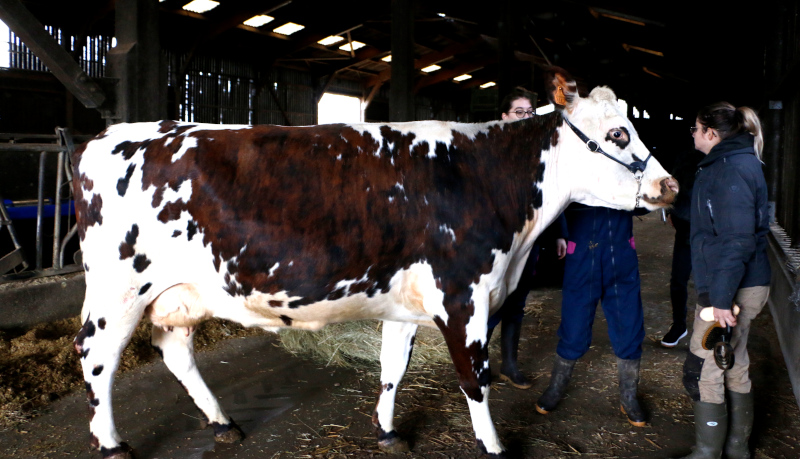 Nostalgie aura bientôt 5 ans. Imposante et calme, le dos droit et l’œil indifférent, elle arbore ces fameuses lunettes autour des yeux et les belles taches brunes qui font la réputation de sa race. Nostalgie est une vache normande. Choisie parmi 85 vaches du lycée agricole de Sées, dans l’Orne, elle doit concourir au prochain Trophée international des enseignements agricoles (TIEA), à la grand messe parisienne du salon de l’agriculture, début mars. Comme chaque année, c’est là qu’une cinquantaine d’équipes composées d’élèves majoritairement français mais aussi venus d’ailleurs, s’y mesurent pour porter haut les couleurs de leurs animaux régionaux.